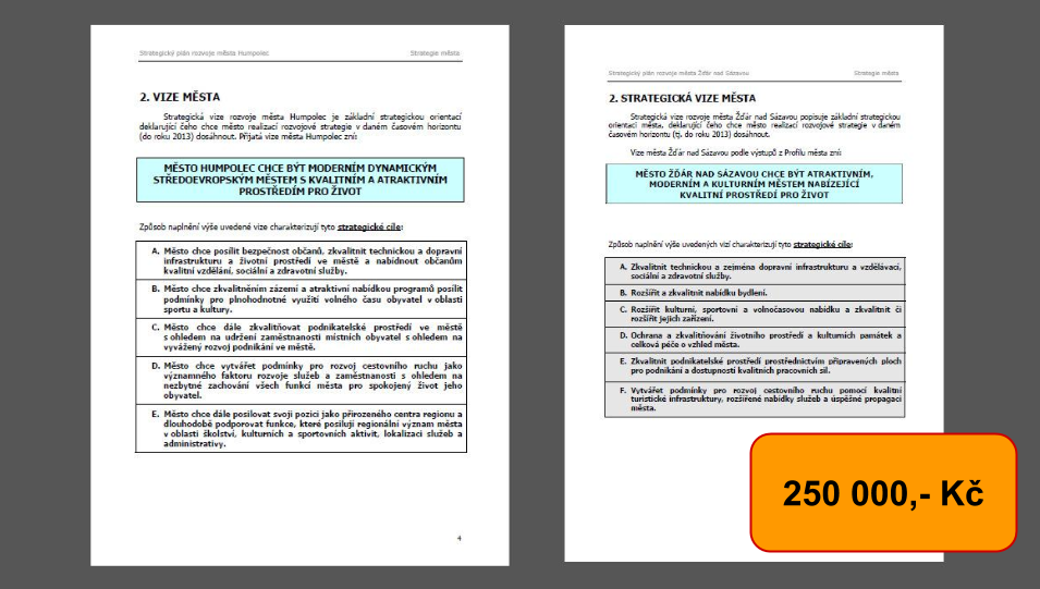 250 000 Kč stálo okopírování strategie a vize města Humpolec, které svoji strategii publikovalo o rok dříve než Žďár. Můžete chvíli sami hádat, která z vizí města je vizí Žďáru a která Humpolce: MĚSTO ___ CHCE BÝT ATRAKTIVNÍM, MODERNÍM A…